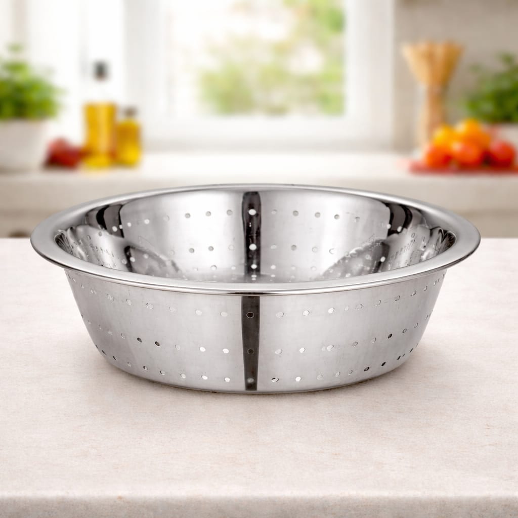 The Sorabh Rice Chalna (Without Stand) is a durable stainless steel strainer specially designed for washing and draining rice efficiently. Made from high-quality stainless steel, it ensures long-lasting performance and resistance to rust. Its fine perforation design allows proper water drainage while preventing rice grains from slipping out. Lightweight and easy to handle, it is an essential tool for every kitchen.